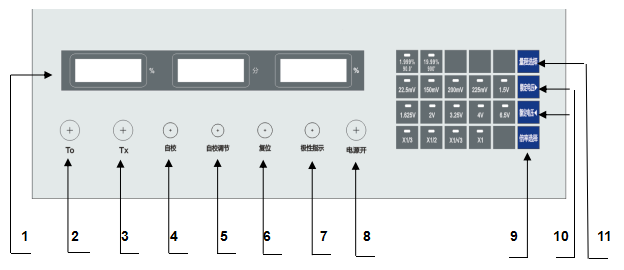 10— 額定電壓選擇按鍵。該按鍵必須和上圖中標號為9的按鍵組合使用,使設(shè)定的電壓與實際所測量的電子式電流(或電壓)互感器額定二次電壓相一致。